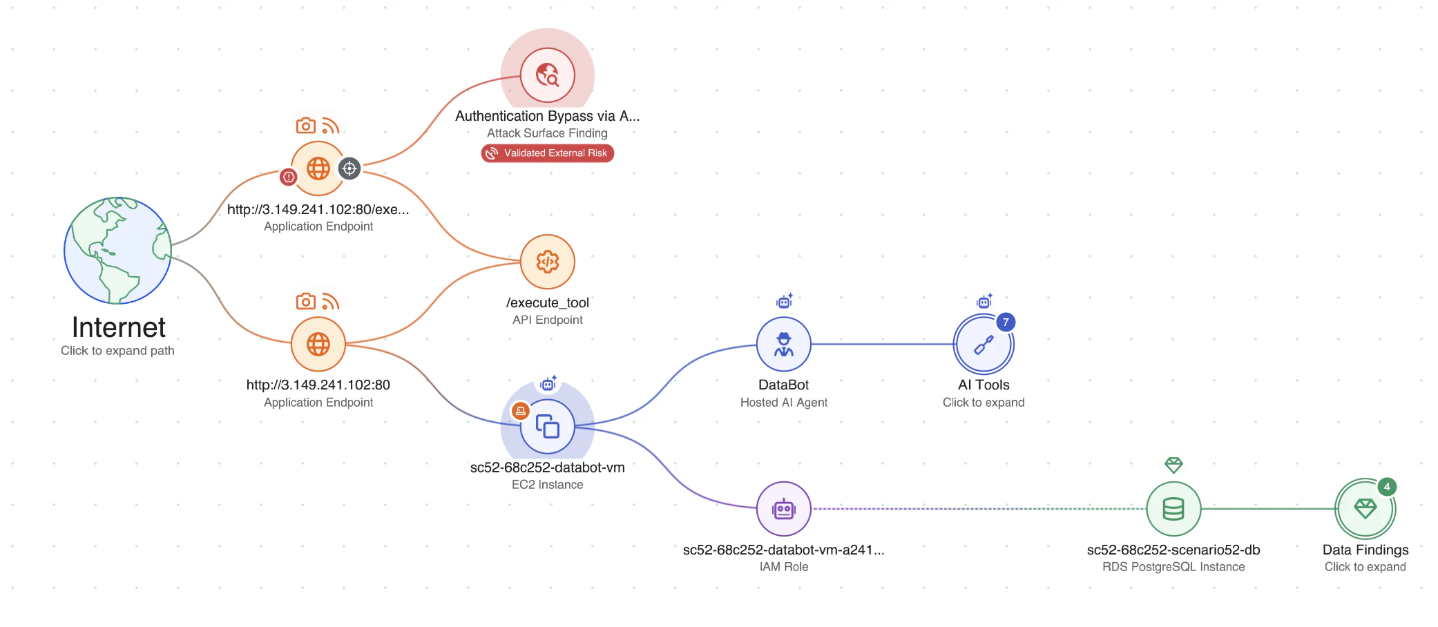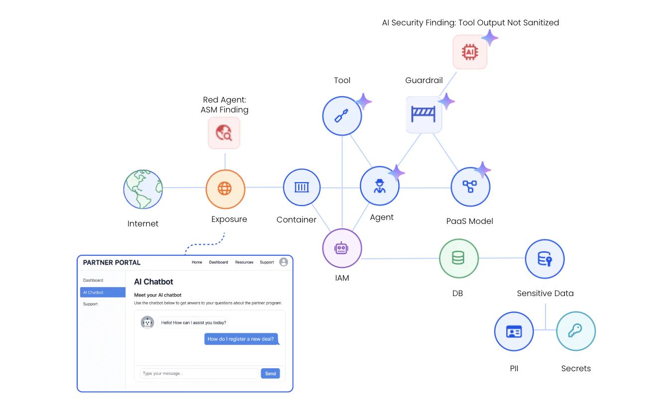 When evaluated together, these signals reveal a clear attack path — where an external attacker could interact with the chatbot, manipulate prompts, and cause the agent to retrieve sensitive information through its connected tools.