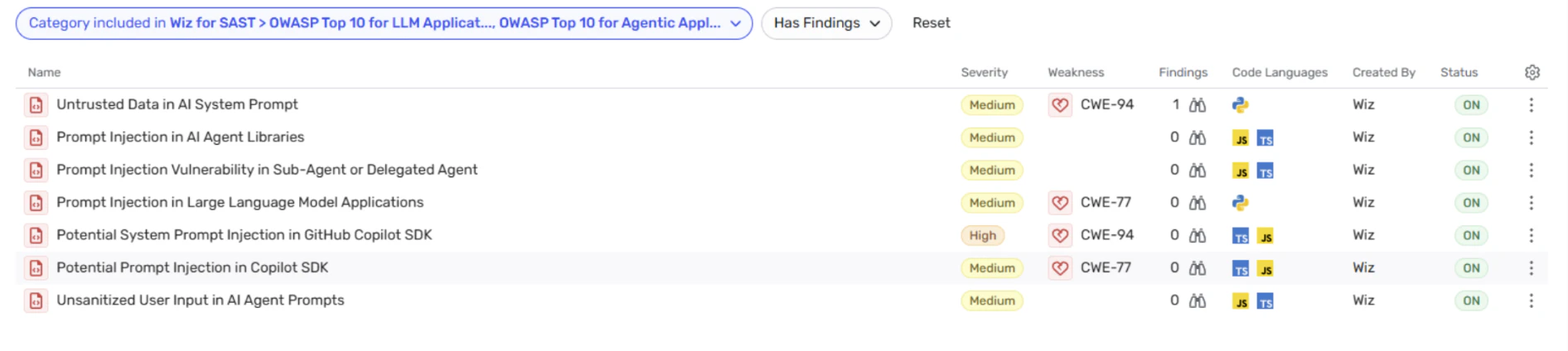Wiz analyzes AI logic and integrations in code to detect unsafe patterns such as insecure tool usage, embedded credentials, and risky combinations across application logic and infrastructure access. Detecting these issues early helps prevent vulnerable AI systems from reaching production.