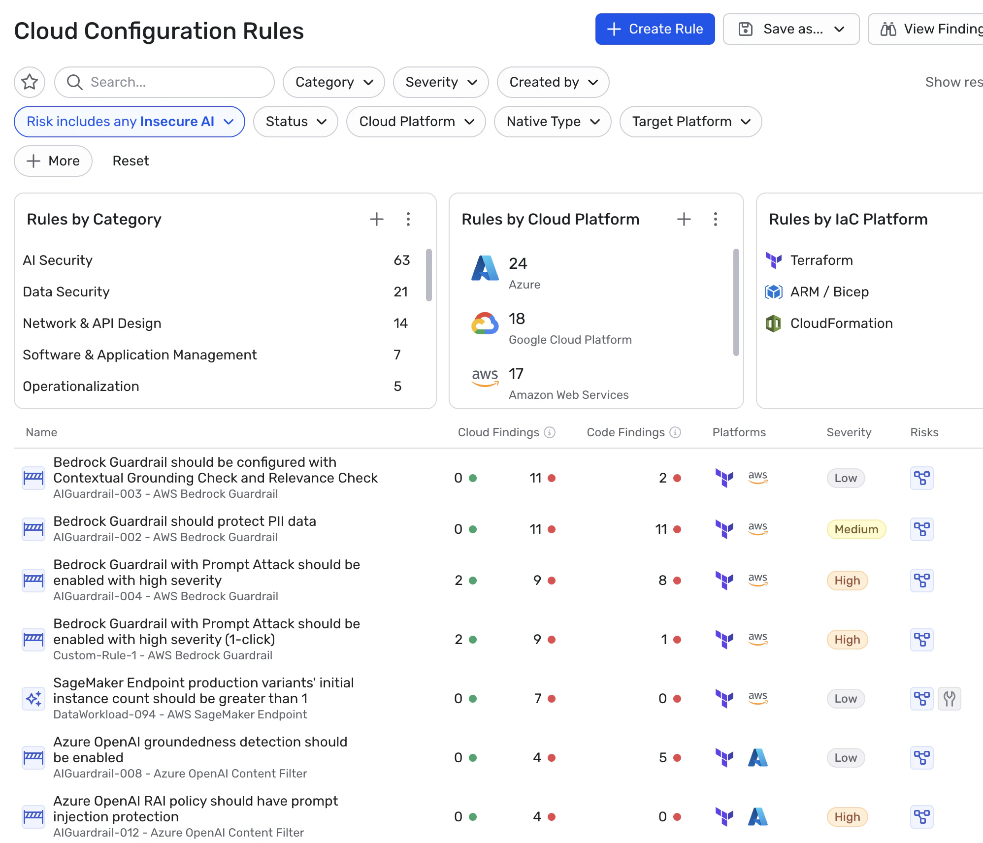 Wiz detects these issues through both AI-specific security rules and cloud configuration analysis, enabling teams to identify misconfigurations regardless of whether AI systems are defined in code, deployed in workloads, or hosted through AI platforms.