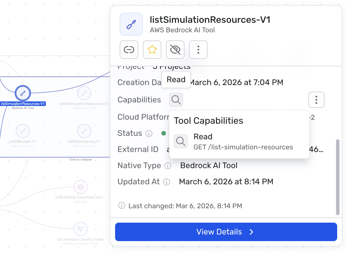 Wiz identifies the tools connected to agents and models and classifies their capabilities — such as whether a tool can read data, write or modify systems, expose sensitive data, or execute code. This allows security teams to clearly understand what an AI system can access or change and detect overly permissive or risky integrations before they can be abused.