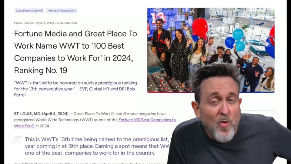 How can my organization become a great place to work? This is a common question we hear from clients of WWT. While there isn't a one-size-fits-all approach to culture, the most successful organizations integrate company culture with advanced technology to leverage data-driven insights and drive measurable business outcomes. Join WWT's experts Joe Berger, VP of Digital Experiences, and Krista Bush, VP of Global Employee Experience, as they discuss a framework for creating a sustainable and resilient company culture — a framework that has placed WWT on the Great Place to Work® list for 13 years running.